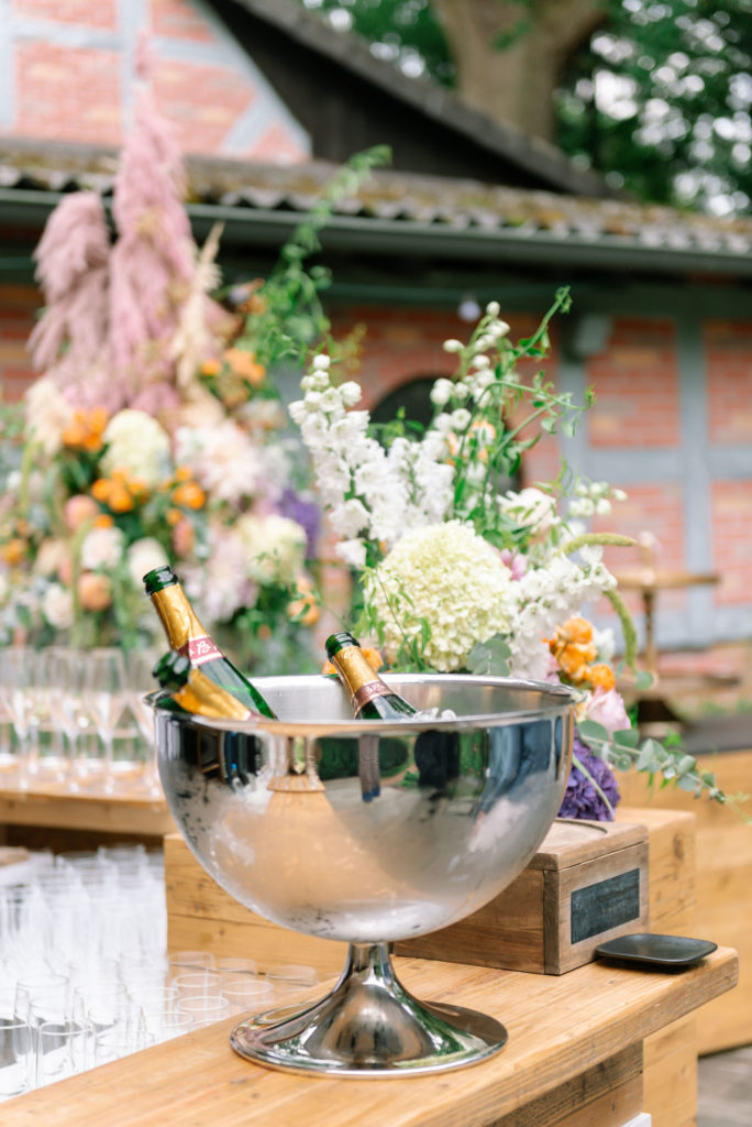 „Natürlich kann man sich nicht auf Sonnenschein verlassen – denn Sonne kann man leider nicht kaufen“, gibt Nadine Metgenberg zu bedenken. „Aus diesem Grund entwickeln wir bei Fine Weddings & Parties immer einen Alternativplan.“ Ein Standbye-Zelt oder große Schirme können hier eine kleine Katastrophe abwenden. „Wenn das Wetter mitspielt bietet sich dann natürlich auch ein Feuerwerk an.“ Doch auch das will organisiert werden: „Mit dem Pyrotechniker sprechen, Genehmigungen einholen und auch im Blick haben, ob die Gäste ein Feuerwerk sehen könnten – es gibt beispielsweise häufig hohe Bäume auf dem Gelände“, all das, so Nadine, übernehmen sie und ihr Team gerne.