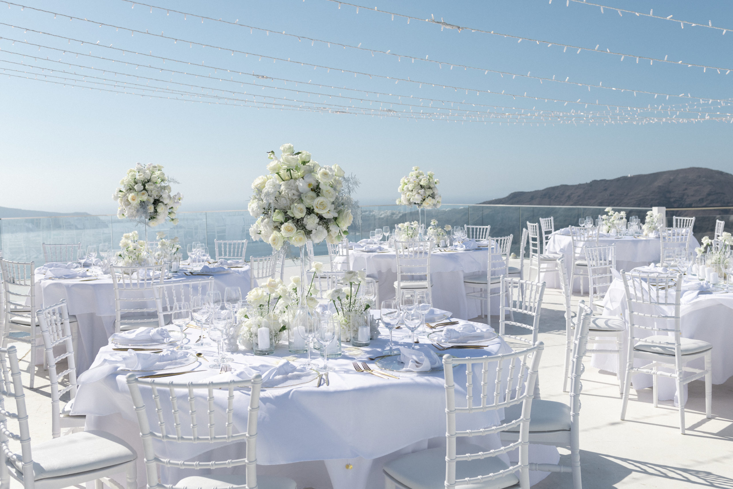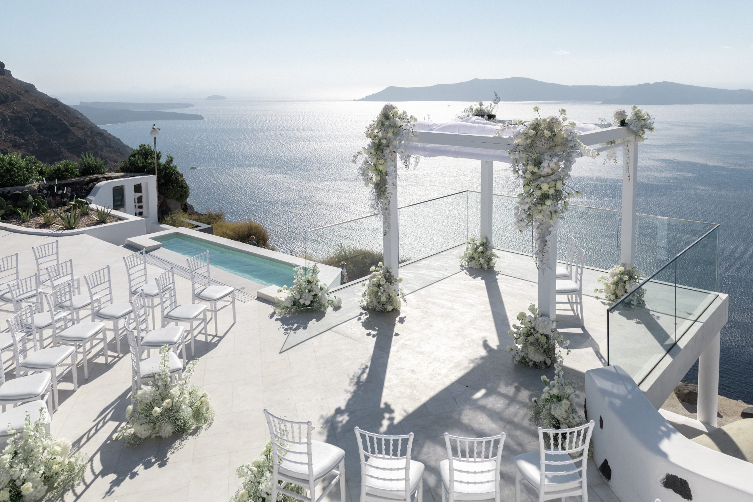 Keine Frage, eine Hochzeit auf Santorini zu organisieren benötigt sehr viel Fingerspitzengefühl und Organisationstalent. Bestes Beispiel: die Blumen-Deko. Mein Team und ich haben auch im Ausland den Anspruch, den schönsten Tag des Lebens bis ins kleinste Detail zu perfektionieren. Und so haben wir bereits Wochen vor den Feierlichkeiten den Transport der wertvollen Fracht organisiert. 18 Boxen mit Rosen, Nelken und unzähligen weißen Orchideen wurden auf der Blumenauktion in Alsmeer ersteigert, jede einzeln mit Wasser versorgt und dann per Luftfracht nach Griechenland gebracht. Insellagen wie Santorini, Mallorca oder Ibiza erfordern extrem viel Logistik. Alles muss eingeflogen oder verschifft werden, was einfach ein Event auf Inseln sofort teurer macht. Was ich damit sagen will: Zwar gibt es im Netz unzählige Pauschal-Angebote für Trauungen auf der Trauminsel, mein Apell jedoch ist: Vertraut ausschließlich auf echte Profis!