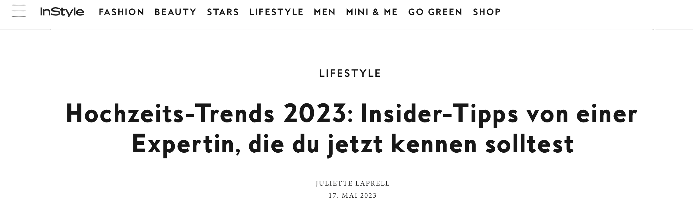 Das bekannte InStyle-Magazin hat mich gefragt, ob ich nicht in Sachen Hochzeitstrends 2023 aus dem Nähkästchen plaudern kann. Das habe ich natürlich gerne gemacht und dem Lifestyle-Magazin meine Top-Tipps verraten. Die besten Tipps wurden von der InStyle sogar in einem Video zusammengefasst. Hier könnt ihr es euch anschauen und nachlesen. Viel Spaß dabei!